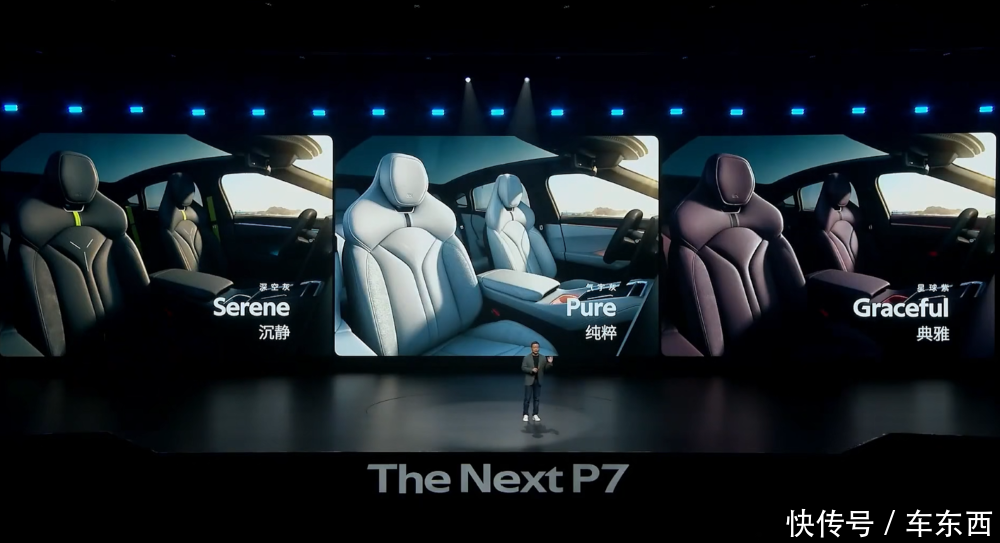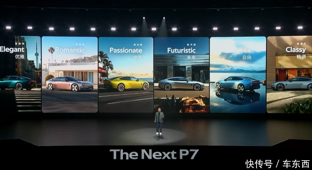 在发布会上,不同车漆颜色的全新小鹏P7依次登场,全新小鹏P7上台时车内还有嘉宾,与何小鹏一同展示全新小鹏P7的车漆颜色设计。