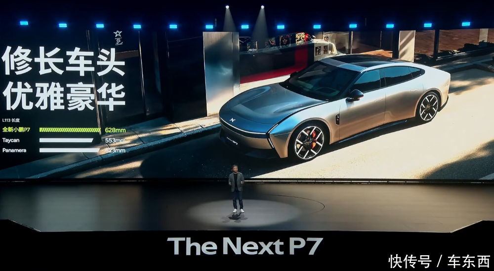 “修长”方面,全新小鹏P7的L113(驾驶员脚踏板到前轮的中心区的距离)长度为628mm,比保时捷Taycan和Panamera都要更长,带来更协调的外观比例。