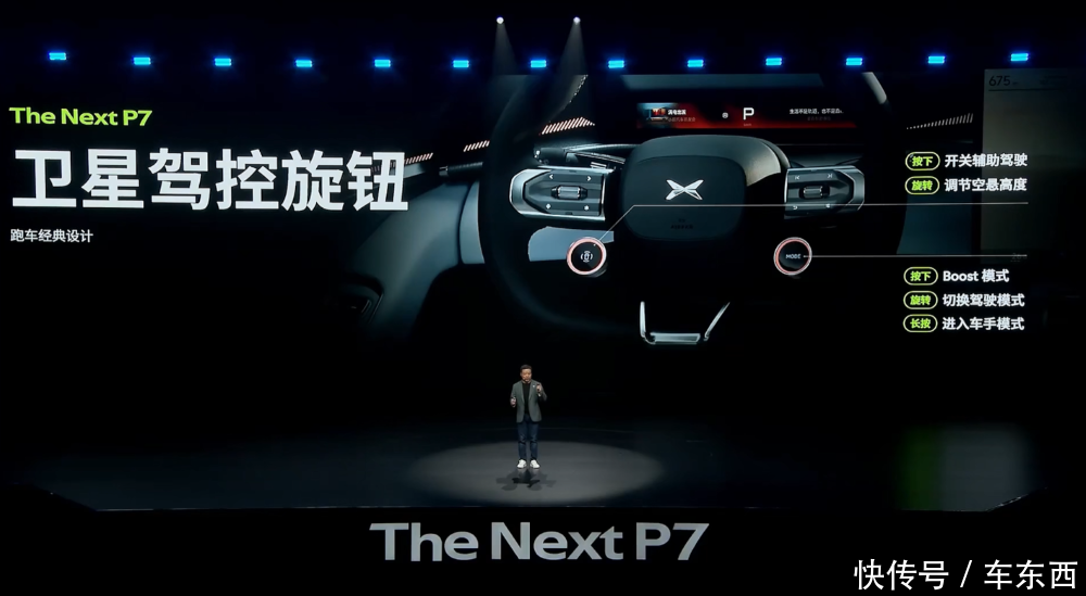 全新小鹏P7的卫星驾控旋钮不但能开关辅助驾驶、调节空悬高度,还可以用“小蓝灯”的形式展示辅助驾驶开启状态。