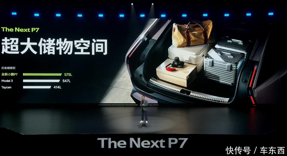 储物空间方面,全新小鹏P7后备箱空间达到575L,前备箱空间56L,何小鹏表示这在轿跑中是一个非常大的储物空间。
