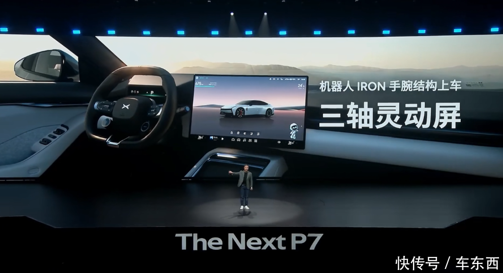中控屏上,全新小鹏P7也采用了特殊的设计,其中控屏可以上下左右自动摆动,也可以手动转动,何小鹏表示其采用了小鹏机器人IRON的手腕结构,通过了100万次动作耐久测试。